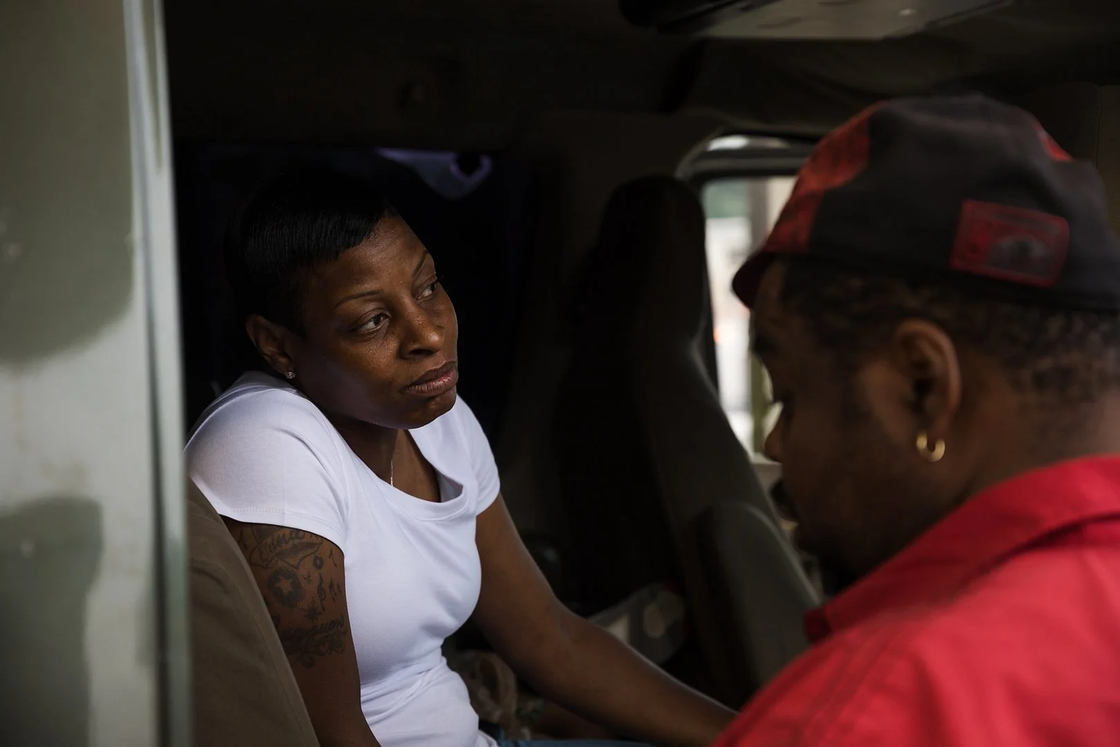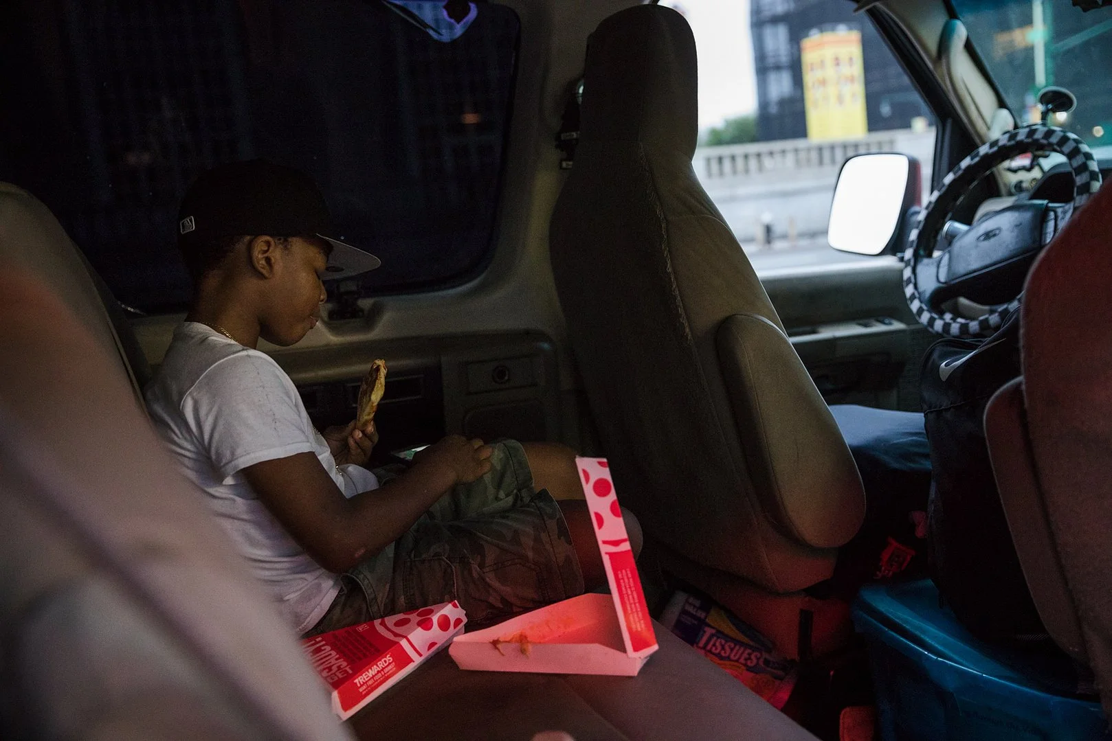 Kaywonda Banks sits in an unmarked olive green van parked near Barclays Center, two full bags of food and house supplies between her legs and her 8-year-old son in the seat next to her.
